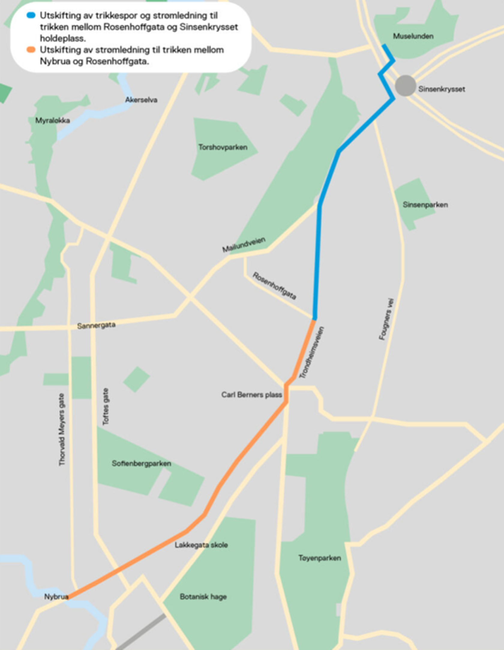 Den oransje og blå markeringen viser hvor det skal arbeides i Trondheimsveien, mellom Nybrua og Muselunden. Ledningene som gir strøm til trikken, skal skiftes ut på hele strekningen. Mellom Rosenhoffgata og Muselunden skal også trikkeskinnene byttes ut.
