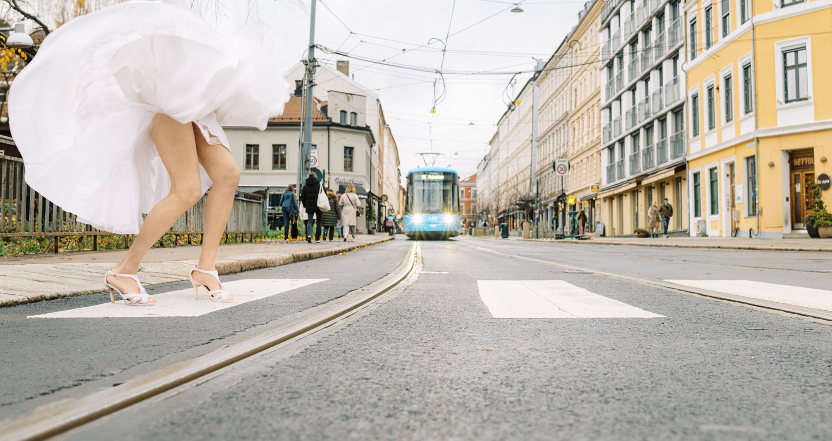 Marilyn som ikke respekterer vikeplikten for trikken.